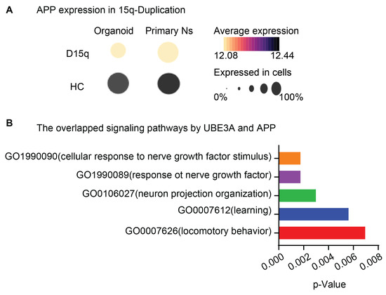 (A) Relative APP expression in Dup15q. The published literature [70] grouped relative APP from patients’ iPSC-derived organoids or postmortem primary cells by RNA-seq analysis. (B) Predicated signaling pathways that UBE3A and APP may share in neuronal functions. (https://www.ndexbio.org/iquery/, accessed at 17 Feb 2025).