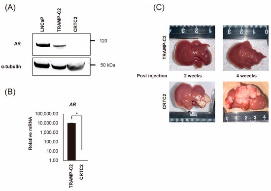 Establishment of mouse CRPC cell line (CRTC2) and the liver metastasis model. TRAMP-C2 cells were injected into the subcutaneous tissue of a female nude mouse. The growing tumor was transferred to a culture dish and cultured for five generations in the absence of androgen, then CRCT2 cells were established. (A) Expression of AR protein was determined for CRCT2 compared with LNCaP and TRAMP-C2 (anti-AR antibody and anti-α-tubulin antibody can react to both human and mouse protein). (B) Downregulation of AR in CRCT2 was also confirmed by real-time quantitative PCR (* p < 0.01). (C) TRAMP-C2 and CRTC2 cells (2 × 106 cells/100 µL in PBS) were injected into the mouse spleen. After 2 and 4 weeks, mice were scarified. Representative macroscopic appearance of the liver is shown.