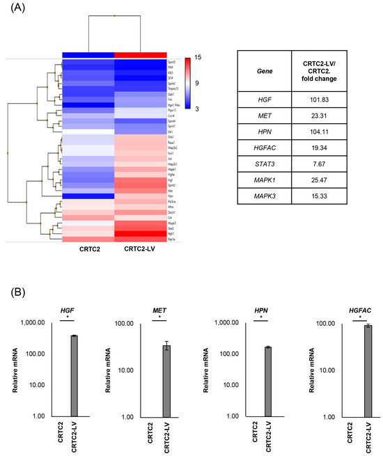 Comparison of mRNA expression between non-metastatic and metastatic CRTC2. (A) Results of microarray analysis of CRTC2 and the liver metastasis are shown. Microarray analysis was outsourced to Cosmo Bio Co., Ltd. (Tokyo, Japan). The company performed cDNA synthesis, labeling, hybridization, washing, and scanning processes using Clariom S Array, mouse according to their proprietary protocols and equipment. The raw data provided were normalized and analyzed using Transcriptome Analysis Console Software. (B) Expression of HGF, MET, HPN and HGFAC was also confirmed by real time RT-qPCR (* p < 0.05). The figure shows ratios to CRTC2.