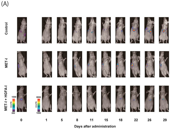 To evaluate the therapeutic effects of MET-I and HGFA-I on liver metastasis, we analyzed the therapeutic effect of both agents on a mouse model with liver metastasis. Luciferase-expressing CRTC2-mCherry-luc2 (CRTC2-luc2) cells were injected into the spleen of castrated male nude mice. Bioimaging was used to confirm the formation of liver metastases by injection of 100 μL of 100 mM D-luciferin. Mice with confirmed liver metastases were divided into three groups: (1) control group (vehicle), (2) group with single use of MET-I, and (3) group with combination of MET-I and HGFA-I. As shown in Figure 4A, both the single-use and combination-therapy groups showed inhibition of liver metastasis progression compared to the vehicle group. Similar to the result of in vitro analysis, the combination-therapy group showed the strongest reduction for liver metastasis compared with the single-use group. Significance was determined by difference in luminous intensity, number of metastases and liver/body weight ratio (LBR) (Figure 4B–D). The degree of luminous intensity differed in a time-dependent manner. Significant therapeutic effect was observed in both treatment groups (single and combined) compared with control, and the strongest effect was confirmed statistically in the combination-therapy group in all evaluations. The luminescence count of liver metastasis was reduced to 30.4% in the monotherapy (MET-I) group and 10.8% in the combination-therapy group compared with control group (p = 0.011, 0.047, respectively). Pathological evaluation was also performed. As shown in Figure 4E, large cancer nests composed of viable cancer cells were observed in the control group (upper two horizonal line, inset: T). The border between cancer nests and non-malignant liver tissue (inset: N) is also shown (black arrows). Increased phosphorylation of MET was observed in cancer cells (inset: T), whereas MET phosphorylation was downregulated in non-malignant liver tissue (inset: N). Smooth muscle actin (SMA)-positive stromal cells were diffusely presented in the peri-cancerous area; however, no apparent SMA-positive cells were observed in non-malignant liver tissue except for vessel wall (inset: N). The number and size of cancer nests were apparently reduced, and large central necrosis (*) was evident in the cancer nests of both treatment groups (column of HE, middle, and lower lines). Immunohistochemical staining revealed decreased phosphorylation of MET in treatment group compared with control (column of p-MET, middle, and lower lines). Phosphorylation of MET remained, but weakly in the single-use therapy group; however, almost complete inhibition was observed in the combination-therapy group (inset: T). SMA-positive stromal cells also remained around surviving viable cancer cells in both treatment groups (inset: T). SMA has been reported to be a marker of CAF [22]. Considered with the appearance of MET phosphorylation, it is suggested that providing HGF forms CAF and the activating system remains active in the group with the single-use MET-I; however, the system is almost completely downregulated in the group with MET-I-HGFA-I combined-therapy group.