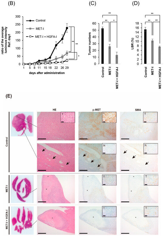 The effect of inhibition of MET and HGF-activation in liver metastasis, in vivo analysis. (A) A suspension of 2 × 106 CRTC2-luc2 cells/100 µL in PBS was injected into the spleen of orchiectomized male nude mice. Bioimaging was used to confirm the formation of liver metastases by an injection of 100 μL of 100 mM D-luciferin. Mice with confirmed liver metastases were divided into three groups: (1) control group (vehicle), (2) a group with single use of MET-I (30 mg/kg, oral administration, every other day), and (3) a group with a combination of MET-I and HGFA-I (5 mg/kg, intravenous injection, every other day). The figure presents representative images of liver metastasis progression captured by the bioimaging device during the treatment period. (B) Luminescence counts were detected as the average value within the range encompassing the liver, and the temporal changes in each group are shown relative to the value on the day treatment started. Values are presented as mean ± SE (N = 4, each group). The significance was also determined by the number of metastases (C) and liver/body weight ratio (LBR, D). * p < 0.05, ** p < 0.01. (E) Representative histological findings are shown. Th upper two horizonal lines are control, the middle line shows single-use therapy (MET-I), and the lower line is combination-therapy (MET-I and HGFA-I). Vertical columns are, from left to right, loupe image, hematoxylin-eosin (HE) staining, immunohistochemical staining of phosphorylation of MET (p-MET) and that of smooth muscle actin (SMA). The border between cancer nests and non-malignant liver tissue (inset: N) is also shown (black arrows). Scale bar = 500 μm, 50 μm (inset). T: tumor, N: non-malignant live tissue, * necrotic area.