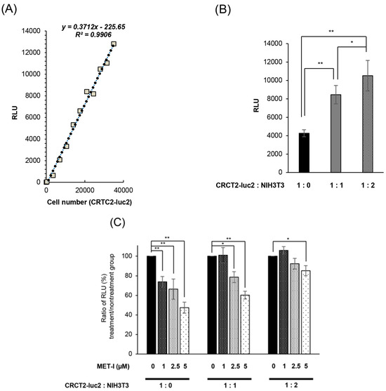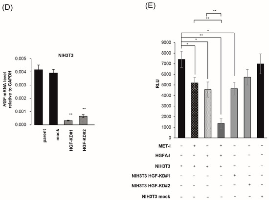 Inhibition of fibroblast-derived HGF: analysis by co-culture with mouse fibroblast cell, NIH3T3. (A) Reference for measurement. Luminescence was measured at 30 s after administration of D-luciferin, and the proliferation of CRCT2-luc2 was measured as the average intensity. Validation between counted cell numbers and degree of luminescence was determined (R2 values ≥ 0.990). (B) Proliferation of CRCT2 cells with or without NIH3T3 cells (mouse fibroblast) by degree of luminescence. Ratios of initial cell numbers of CRCT2 and NIH3T3 are shown as 1:0, 1:1, 1:2. * p < 0.05, ** p <0.01. (C) Therapeutic effect of MET-I with various concentration in co-culture with different degree of NIH3T3. The effect was determined by luminescence. Luminal intensity of treatment group was compared with the non-treatment group. Ratios of initial cell numbers of CRCT2 and NIH3T3 are shown as 1:0, 1:1, 1:2. * p < 0.05, ** p < 0.01. (D) Quantification of HGF mRNA level in NIH3T3. The result of real time quantitative PCR in each cell line is shown. ** p < 0.01. KD: knock down (E) Inhibition of CRCT2 cell proliferation by MET-I and HGFA-I. CRCT2 cells are cultured with NIH3T3, NIH3T3 HGFKD#1, NIH3T3 HGFKD#2 or NIH3T3 mock (ratio of initial cell numbers of CRCT2 and NIH3T3 is 1:2). CRTC2 cells were pre-cultured in FBS-free DMEM for 24 h. The cells were seeded in a 96-well plate at a density of 2 × 104 cells/100 µL in FBS-free DMEM. The cells were then treated with each agent (final concentration of 2.5 µM for MET-I and 40 µM for HGFA-I) at 37 °C for 2 h, and incubated at 37 °C for 96 h. Cell proliferation was analyzed by detecting the absorbance at 490 nm and calculated as a ratio to the absorbance at day 0. Therapeutic effect was determined by the luminescence and statistically compared with control (co-culture with NIH3T3 without treatment). * p < 0.05, ** p < 0.01.