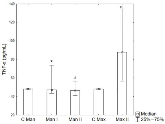 TNF-α concentrations in the periosteum. C Man—control group mandible, C Max—control group maxilla (before implantation), Man I—Group I mandible (fracture), Man II—Group II mandible, Max II—Group II maxilla (bimaxillary osteotomy). * p < 0.05 vs. C Max; # p < 0.05 vs. Man I; •• p < 0.05.