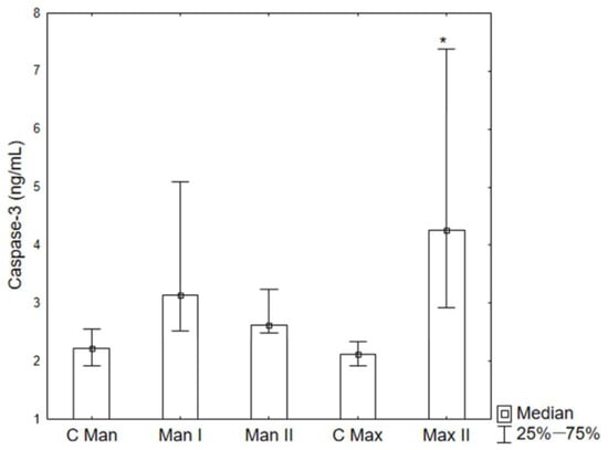 Caspase-3 concentrations in the periosteum C Man—control group mandible, C Max—control group maxilla (before implantation), Man I—Group I mandible (fracture), Man II—Group II mandible, Max II—Group II maxilla (bimaxillary osteotomy). * p < 0.05 vs. C Max.