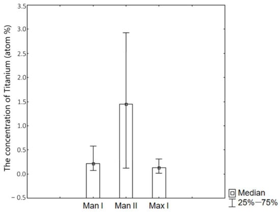 Moreover, in Group I, the mini-plates and screws that were removed from the mandibular body were localized not only in the region of the molars and the angle but also around the chin, premolars, and the canine, whereas in Group II patients, these fixations were localized only in the region of the molars and the angle of the mandible, i.e., at the site of attachments of strong masseter muscles to that bone. The contraction of the above muscles responsible for chewing movements may cause not only micro-movements of fixed bones, plates, and screws but also micro-movements of soft tissues covering the foreign body, which is the bone fixation, intensifying fretting–corrosion processes. All these abnormalities observed in both studied groups may contribute to the significantly different titanium concentrations observed in soft tissues surrounding mandible fixations in the studied Group I and II patients.