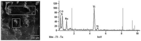 The concentration of titanium ions in the tissues was measured using a Hitachi S-3000N scanning electron microscope (Hitachi, Tokyo, Janan) with an X-ray microanalyzer, equipped with a freezing stage for testing biological preparations and determining the chemical composition (EDS Ultra Dry control microanalysis attachment Thermo Fisher Scientific, Waltham, MA, USA). The use of the freezing stage allowed for the observation of wet samples without the need for drying and vapor deposition. The preparations on the freezing stage were tested at a temperature of −20 °C.