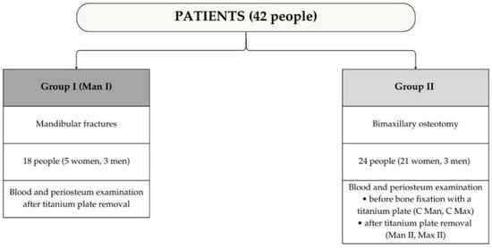 The study involved 42 patients from the Department of Maxillofacial and Plastic Surgery of the Medical University of Bialystok. The participants were divided into two research groups (Figure 9). Group I included patients hospitalized due to isolated mandibular fractures (Man I). In these patients, tissue trauma-induced inflammation developed before admission to the hospital. Therefore, preoperative determination of caspase-3 and TNF-α concentrations in blood and periosteum was not performed. Group II included patients qualified for orthognathic surgery (bimaxillary osteotomy) for indications related to dentofacial deformities. In this group, both the mandible (Man II) and the maxilla (Max II) were operated on. These patients also constituted the control group (C Man, C Max) because they were in good general condition before the surgical intervention, and their periosteum remained intact. The lack of inflammation eliminated the influence of inflammatory factors on the concentration of caspase-3 and TNF-α before surgery. Biological material (blood and periosteum) collected from these patients before surgery was used as a comparative (control) material. The results of these patients before surgery were compared with the results after surgery. Additionally, the results of Group II patients (Man II, Max II) were compared with the results of Group I patients (Man I).