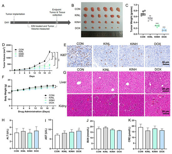 KIN inhibited tumor growth in mouse xenograft tumor models. (A) Timeline for tumor studies. (B) Representative images of tumors. (C,D) Tumor weight and volume were measured. (E) Representative IHC staining of Ki67 from sections of xenografted tumors; scale bar, 20 μm. (F) Body weight changed during treatment with drugs. (G) Representative Hematoxylin and eosin (HE) staining of liver (scale bar, 20 μm) and kidney (scale bar, 20 μm) sections from each group of mice. (H–K) Determination of ALT, AST, BUN, and CRE in serum of each group of mice. KIN, Kinsenoside; CON, control group; KINL, 15 mg/kg KIN group; KINH, 30 mg/kg KIN group; DOX, 2 mg/kg doxorubicin positive control group. N = 6 in each group. * p < 0.05, ** p < 0.01, *** p < 0.001, * vs. CON group.