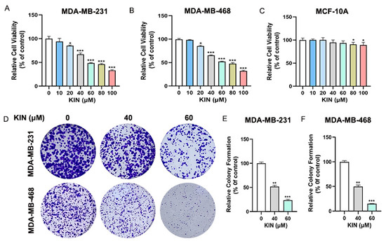 We first evaluated the effects of various concentrations of KIN (0, 10, 20, 40, 60, 80, and 100 μM) on the viability of TNBC (MDA-MB-231 and MDA-MB-468) and normal breast epithelial (MCF-10A) cells using an MTT assay. As shown in Figure 2A–C, KIN inhibited the viability of TNBC cells in a dose-dependent manner without affecting normal mammary epithelial cells MCF-10A. Furthermore, KIN administration significantly reduced colony formation compared with the control group (Figure 2D–F). In summary, the findings unequivocally showed that KIN markedly inhibited the growth of TNBC cells without exhibiting toxic effects on normal breast epithelial cells.