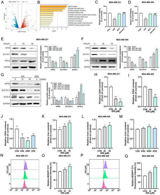 KIN-induced ferroptosis in TNBC cells. (A) Volcano plot of downregulated and upregulated genes in control and KIN treatment MDA-MB-231 cells. (B) KEGG enrichment analysis based on differentially expressed genes. (C) Ferroptosis inhibitors used in MDA-MB-231. (D) Ferroptosis inhibitors used in MDA-MB-468. (E) Ferroptosis pathway protein levels in MDA-MB-231 cells after KIN treatment were detected. (F) Ferroptosis pathway protein levels in MDA-MB-468 cells after KIN treatment were detected. (G) Ferroptosis pathway protein levels in animal experiments after KIN treatment were detected. (H–J) GSH levels in vitro and in vivo were detected by GSH kit. (K–M) Total iron levels in vitro and in vivo were detected by iron detection kit. (N–Q) Lipid peroxidation levels were evaluated by C11-BODIPY fluorescent probe. Data are representative of three independent experiments. KIN, Kinsenoside; DFO, deferoxamine; CON, control group; KINL, 15 mg/kg KIN group; KINH, 30 mg/kg KIN group; DOX, 2 mg/kg doxorubicin positive control group. * p < 0.05, ** p < 0.01, *** p < 0.001, ### p < 0.001, * vs. CON group, # vs. KIN group.