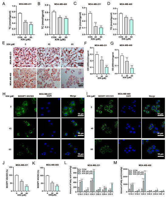 An expanding dataset indicates a significant tumor-promoting function of increased lipid droplet buildup in a variety of cancers. As shown in Figure 4A–D, KIN significantly reduced the accumulation of triglycerides (TC) and total cholesterol (TG) in TNBC cells in a dose-dependent manner. In order to examine the modulatory function of KIN on lipid droplet formation in TNBC cells, we initially assessed LD formation using Oil Red O staining in MDA-MB-231 and MDA-MB-468 cells. Notably, KIN treatment decreased the accumulation of LD in the two TNBC cell lines (Figure 4E). Additionally, the cells were exposed to isopropanol to liberate oil droplets, revealing that KIN significantly reduced lipid buildup in TNBC cells compared to the control (Figure 4F,G). The accumulation of LD in the cell lines was also assessed using the fluorescent dye BODIPY 493/503. KIN treatment significantly reduced LD accumulation in MDA-MB-231 (Figure 4H,J) and MDA-MB-468 cells (Figure 4I,K) compared to the control group. When the formation of intracellular LD is inhibited, PUFAs will accumulate in large amounts within the cell. The presence of PUFAs can promote the occurrence of ferroptosis [22]. PUFAs quantification assay revealed an increased accumulation of PUFAs within the KIN treatment group (Figure 4L,M). These results confirmed that KIN could significantly inhibit the formation of LD in TNBC cells.