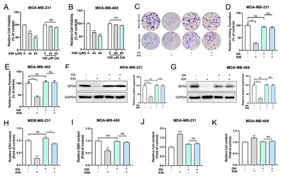 KIN induces ferroptosis in TNBC cells by inhibiting lipid droplet formation. (A,B) MDA-MB-231 and MDA-MB-468 cells were treated with KIN and OA for 48 h, and cell viability was measured by MTT assay. (C) MDA-MB-231 and MDA-MB-468 cells were treated with KIN and OA for 2 weeks, and colony formation of cells was detected by crystal violet staining. (D,E) Quantification of colony numbers from Image J. GPX4 protein levels in MDA-MB-231 (F) and MDA-MB-468 (G) cells after KIN and OA treatment were detected. (H,I) GSH levels in vitro were detected by GSH kit. (J,K) Total iron levels in TNBC cells after KIN and OA treatment were detected by iron detection kit. Data are representative of three independent experiments. KIN, Kinsenoside; OA, oleic acid. * p < 0.05, ** p < 0.01, *** p < 0.001, ns p > 0.05.