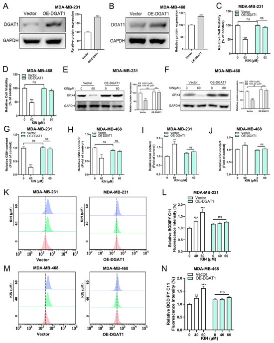 In this study, we found that KIN significantly reduced the expression of DGAT1 both in vitro and in vivo. In order to examine whether DGAT1 plays a key role in modulating ferroptosis sensitivity, we conducted KIN overexpression experiments. DGAT1 overexpression significantly increased the protein expression level of DGAT1 in TNBC cells (Figure 7A,B). We found that DGAT1 overexpression significantly reduced the sensitivity of TNBC cells to KIN (Figure 7C,D). Figure 7E,F shows that DGAT1 overexpression significantly reduced the inhibitory effect of KIN on the GPX4 protein in TNBC cells. As in our previously presented data, KIN significantly reduced the level of GSH in TNBC cells, but this effect was mitigated by the overexpression of DGAT1 (Figure 7G,H). After DGAT1 was overexpressed in TNBC cells, the effect of KIN in increasing iron ion levels was reduced significantly (Figure 7I,J). Additionally, after the overexpression of DGAT1, the lipid ROS levels affected by KIN were partially restored (Figure 7K–N). The aforementioned evidence indicated that KIN promoted ferroptosis in TNBC cells by inhibiting DGAT1 expression.