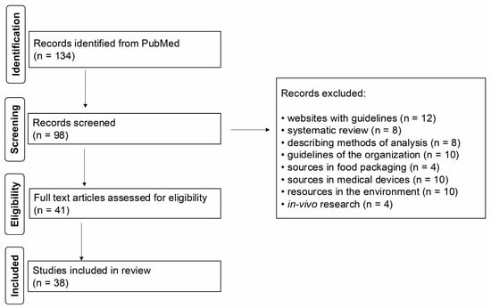 The literature search followed the Preferred Reporting Item for Systematic Reviews and Meta-Analyses (PRISMA) guidelines [], followed by systematic classification of selected articles (Figure 1). Accordingly, when searching the open-access PubMed database, we decided to select only the most recent literature from the last 10 years (from 1 August 2015 to 31 December 2024). The search was limited to English-language articles and only in open access using the following keywords: “sources of mercury food packaging”, “mercury medical products”, “mercury sources the environment”, “mercury health effects”, “mercury global guidelines”, “mercury test methods”, “mercury vs. in-vivo studies”, “mercury toxicity”, “mercury exposure”, “mercury poisoning”, “mercury”.