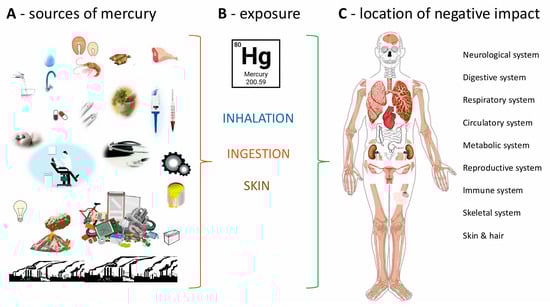 Sources of mercury (A), its exposure (B), and location of negative impact (C) on various parts of the human body. (A)—More information on sources is provided in Section 2, Section 3 and Section 4 (e.g., from food as well as from equipment or everyday household appliances). (B)—The forms of exposure (internal or external routes) are described in Section 5. (C)—The effect of exposure is described in the individual sections of Section 5.