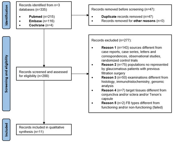 PRISMA diagram of the systematic literature review process. From 3 different databases, 335 records were identified. After removing duplicates, 288 items were selected. Then, 277 records were excluded because of inclusion criteria; thus, 11 records were included in the qualitative synthesis.