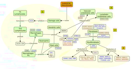 Plasma proteins promote the migration of neutrophils, macrophages, and lymphocytes to the surgical site, which initiates the inflammatory phase []. Immunohistochemical studies have shown that mast cells [], macrophages [], and myofibroblasts [,], on the cellular side, and TGFβ [] and interleukin 6 (IL6) [], on the humoral side, are the main players involved in the inflammatory process following FB formation. Furthermore, genetic studies have shown that many elements are involved in the inflammatory response after GFS: interleukins (IL6 [,] and IL13RA2 [] are upregulated; IL1 [] and IL33 [] are downregulated), integrins (ITGA2 [] and ITGB5 [] are upregulated), and growth factors (CTGF/CCN2 [], HGF [], and AGT [] are upregulated; IGFBP5 [] and FGFR3 [] are downregulated). These alterations suggest the presence of autocrine triggers, which sustain the fibrotic response.