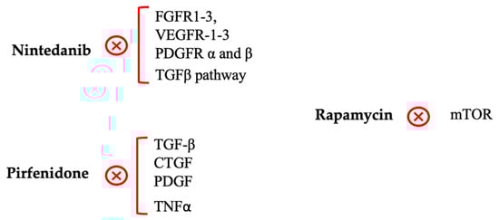 Pirfenidone and nintedanib are two antifibrotic agents that have been demonstrated to slow the decline of respiratory function, but without reverting or arresting the disease progression [,,,,]. They were approved for patient care by the FDA in 2014, and their common physio-pathological mechanism entails TGFβ interference [,,], counteracting inflammation and senescence [,].