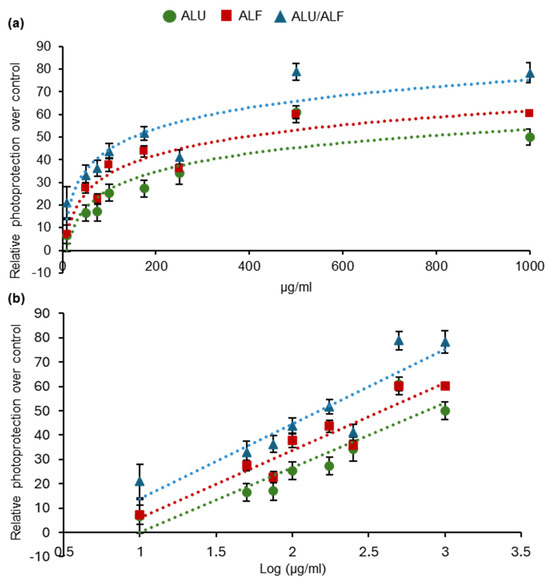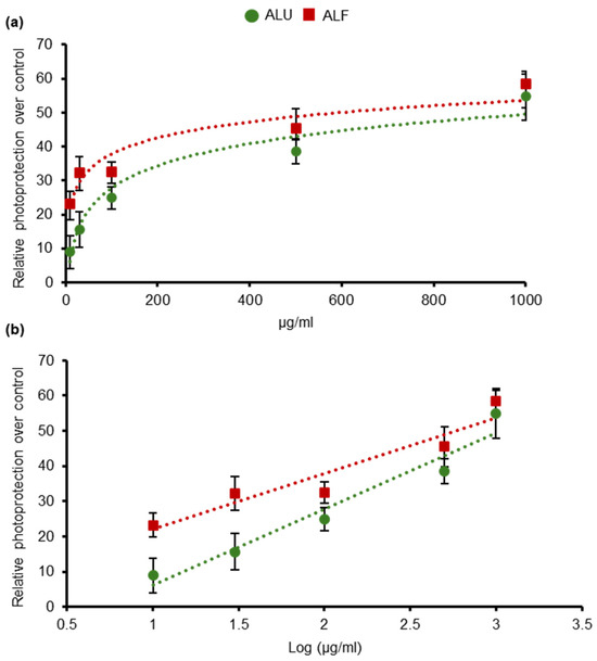 Figure 1. Photoprotective effect of ALU and ALF aqueous extracts. The X-axis represents the concentration of the extracts used in the treatments, expressed in linear scale in graph (a); and in a logarithmic scale in (b). The Y-axis represents the average values of relative photoprotection measurements. Survival of non-treated samples was 54.75%. UVB irradiation dose = 0.8 J/cm2. The different extracts were tested at 10, 30, 100, 500, and 1000 μg/mL. For all data points, n ≥ 4 independent wells of cells. Error bars represent the standard error of the mean (SEM). Data trendlines are drawn.