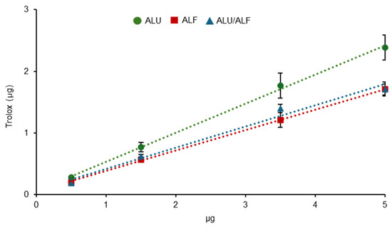 Figure 3. Antioxidant capacity of ALU, ALF, and ALU/ALF analyzed by ferric ion reducing antioxidant power (FRAP). Trolox is used as a reference antioxidant (positive control). FRAP absorbance measures were interpolated in Trolox linear equation to express the antioxidant capacity of the extracts relative to Trolox (μg of Trolox). The X-axis represents the amounts (μg) of the extracts tested. For all samples, n = 3 independent wells of cells. Error bars represent the standard error of the mean (SEM).