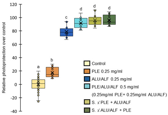 Figure 4. ALU/ALF and PLE incremental effect in photoprotection. The box and whisker plots represent the photoprotective effect shown in fibroblasts. Boxes represent the interquartile range (50% of the data around the median, Q1–Q3), median is marked as a line inside the boxes (Q2). Mean is expressed as “X” inside the boxes. Whiskers extend to each dataset’s maximum and minimum value within 1.5 times the interquartile range. Middle data points are overlapped on the boxes as opened circles. The yellow box represents the data for non-treated control samples. The orange box represents the data for PLE pretreatments at 0.25 mg/mL. The dark blue box represents the data for pretreatments with the specific combination of ALU/ALF at 0.25 mg/mL. The light blue box represents the data for pretreatments of the larger combination of PLE at 0.25 mg/mL and ALU/ALF at 0.25 mg/mL, reaching a final concentration of 0.5 mg/mL. For the sake of comparison, the green boxes represent two simulations of the theoretical addition of PLE (0.25 mg/mL) and ALU/ALF (0.25 mg/mL) datasets. The light green box represents ALU/ALF (0.25 mg/mL) data points plus the average value of PLE (0.25 mg/mL). The dark green box represents PLE (0.25 mg/mL) data points plus the average value of ALU/ALF (0.25 mg/mL). The survival of non-treated samples was on average 57.49%. UVB irradiation dose = 0.8 J/cm2. All treatments have equal variances (Leven’s test). All treatments induced statistically significant photoprotection over the control (one-way ANOVA multiple comparisons, post hoc Tukey). The letters above the boxes represent different statistical groups (one-way ANOVA multiple comparisons, post hoc Tukey). n = 12 independent wells of cells/group.