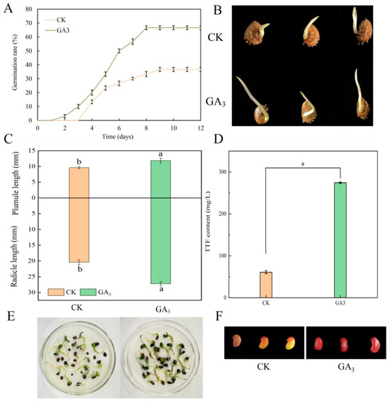 Effects of GA3 on the germination rate and seed vigor of sainfoin seeds. (A) Effect of GA3 treatment on the seed germination phenotype of sainfoin; (B) Effect of GA3 treatment on seed germination rate; (C,E) Effect of GA3 treatment on plumule and radicle lengths; (D,F) Effect of GA3 treatment on seed viability. Error bars represent the standard deviation (SD) of six replicates. Bars with different lowercase letters were significantly different according to Duncan’s multiple range test (p < 0.05). “*” represents a highly significant difference according to the t-test.