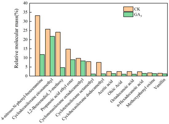 Through gas chromatography-mass spectrometry (GC-MS) analysis, 13 types of endogenous inhibitors were obtained in the methanol extract of seeds (Figure 2). The highest proportion of 4-nitroso-N-phenylaniline was 33.2% in the CK treatment, and the highest proportion of eicomethyl cyclodecasiloxane was 21.83% in the GA3 treatment. Compared to CK, GA3 treatment significantly reduced the proportion of endogenous inhibitors in the total mass, and the proportion of 4-nitroso-N-phenyl-benzenamine in the total mass decreased the most—by 180.64%. These results indicated that GA3 treatment affected the accumulation of endogenous inhibitors and promoted the germination of sainfoin seeds.