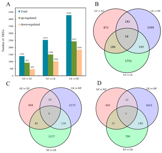 After data collation, three comparison groups, including GZ vs. XZ, XZ vs. LK, and LK vs. MF, were used for subsequent analysis. A fold change ≥ 2 and FDR < 0.01 were used as criteria for differential gene screening. There were 1392, 2534, and 4284 DEGs in GZ vs. XZ, XZ vs. LK, and LK vs. MF, respectively (Figure 3A). Of these DEGs, there were 923, 1508, and 2435 up-regulated genes and 469, 1026, and 1849 down-regulated genes. The Venn diagram shows unique and common DEGs among the different comparison groups. A total of fifty-eight DEGs were co-expressed among the three comparison groups (Figure 3B), with six up-regulated genes and five down-regulated genes co-expressed in the three comparison groups (Figure 3C,D). These results suggest that these co-expressed DEGs may play an important role in GA3-induced dormancy release.