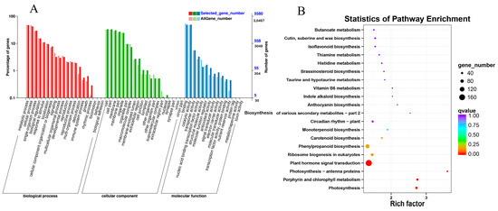 GO and KEGG enrichment analysis of DEGs during germination. (A) GO analysis of DEGs in GA3-treated sainfoin seeds during the germination process; (B) KEGG analysis of DEGs in GA3-treated sainfoin seeds during germination process.