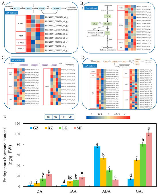 Analysis of hormone signal transduction pathways and endogenous hormone concentrations involved in the germination of sainfoin seeds. (A) Expression profile of DEGs associated with the ZA pathway; (B) Expression profile of DEGs associated with GA pathway; (C) Expression profile of DEGs associated with ABA pathway; (D) Expression profile of DEGs associated with IAA pathway; (E) Comparison of ZT, IAA, GA3, and ABA concentrations in sainfoin seeds under GA3 treatment. Sample names are shown at the bottom of the figure. Expression levels, ranging from blue to red, indicate high to low expression of genes. Different lowercase letters indicate significant differences between GA3-treated seeds at different germination stages according to Duncan’s multiple range test (p < 0.05). The error bar represents three repeated standard deviations (SD).