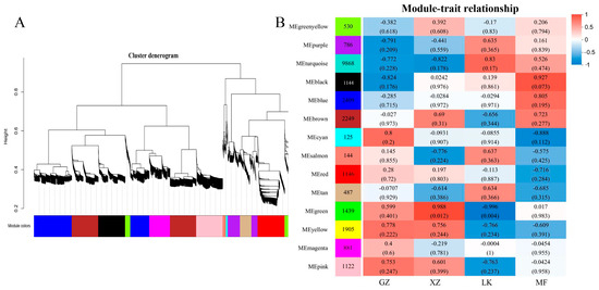 WGCNA of genes during GA3-treated sainfoin seed germination. (A) Cluster dendrograms showing the co-expression modules identified by WGCNA. Each leaf in the tree represents a gene. Branches correspond to highly interconnected gene modules. The color rows below the dendrograms represent the division of modules based on clustering results and the 14 merged modules based on hierarchical clustering; (B) Module-sample relationship based on the Pearson correlation coefficient. Each row corresponds to a module and is represented by a different color. Each column corresponds to samples from different stages of seed germination.