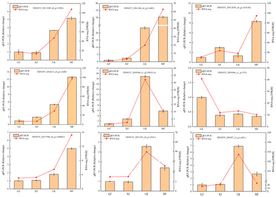 To verify the accuracy of the DEGs screened from the transcriptome data, we randomly selected nine DEGs related to plant hormone signaling and phenylalanine biosynthesis for qRT-PCR analysis. Specific primers were designed using Primer 5.0 software (Supplemental Table S1). qRT-PCR results showed that the expression patterns of the nine genes were consistent with the RNA-seq data (Figure 8), and only the absolute multiplicity of gene expression was different, confirming the high accuracy of the data obtained from the transcriptome analysis.