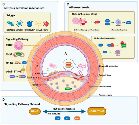 This figure shows the mechanistic interplay between NETosis and atherosclerosis development in the pre-NET stage. Black upward arrow indicates the expression of this substance is upregulated; indigo arrow indicates the substance binds to the corresponding receptor or reaches the corresponding location through inteacellular/extracellular movement; purple arrow indicates that up-regulation of gene expression leads to up-regulation of expression of specific substances; indigo wavy arrow indicates the former leads to the production of cellular biological activities in the latter through some cellular pathways. (A). The central part shows a cross-section of an artery and describes the situation inside the blood vessel during the development of atherosclerosis. Damaged endothelial cells upregulate the expression of chemokines such as VCAM-1/ICAM-1, which can promote neutrophil infiltration. Foam cells and oxLDL gradually accumulate in the intima, and smooth-muscle cells migrate like an intermediate layer. NETs and oxLDL adhere to the intimal surface to form the basic structure of plaque attachment. (B). The upper left part shows the stimuli involved in NETosis activation in the pre-NET stage. These include bacteria, viruses, some pro-inflammatory cytokines (such as IL-6, IL-8, and TNF-α), oxLDL, and ROS. There are also signalling pathways involved in this process, such as the NADPH oxidase pathway, which produces a large amount of ROS; the NF-κB signalling pathway, which upregulates the expression of IL-6/IL-8; and the cGAS-STING signalling pathway, which is the key mechanism of mtDNA leakage and NETosis. (C). The upper right panel shows the effect of factors that promote NETosis in the pre-NET stage on the development of atherosclerosis. For example, pro-inflammatory factors such as IL-6/IL-8 upregulate the expression of TNF-α in macrophages, amplifying the inflammatory response; IFN-γ induces apoptosis, leading to endothelial damage; and IL-36 activates inflammasomes. (D). The lower part shows the interaction between the signalling pathways, i.e., the common stimuli for NF-κB and cGAS-STING (e.g., IL-8/IL-6, VCAM-1), and the positive feedback between the two, leading to a massive production of ROS. Abbreviations: oxLDL (oxidised low-density lipoprotein).