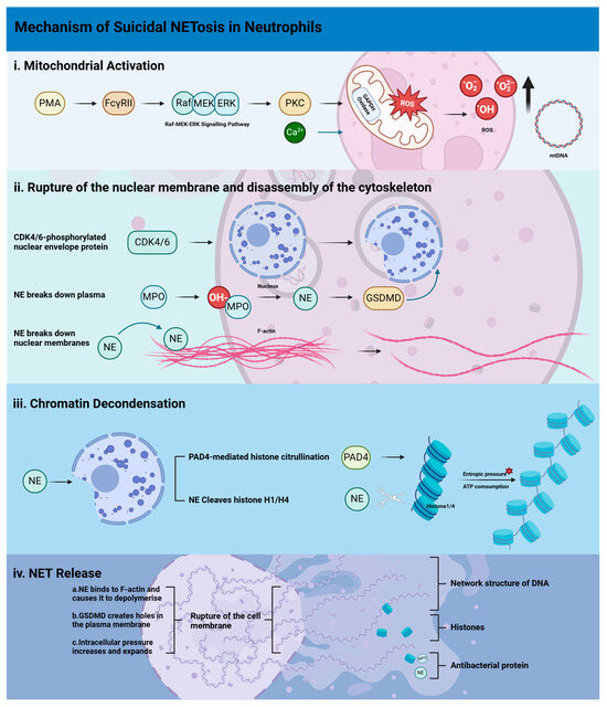 61]. At present, the majority of experiments on NETs involve the suicidal NETosis process. The NETosis process comprises four distinct stages: mitochondrial damage; disruption of the cytoskeleton and nuclear envelope; chromatin depolymerisation; and assembly of antimicrobial proteins on the chromatin scaffold [