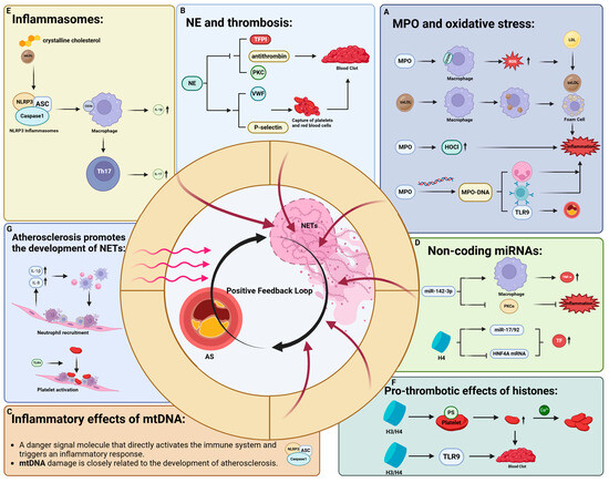This figure shows the role of NETs in AS and its related mechanisms. Black upward arrow indicates the expression of this substance is upregulated; black arrow indicates the former promotes the upregulation of expression or cell behavior of the latter. The dark red arrow indicates the corresponding parts, which are the main components of NETs and promote the occurrence and development of AS. The diagram illustrates the role of each component of NETs in the development of atherosclerosis: (A). MPO can catalyse the formation of oxidised low-density lipoprotein, which promotes the transformation of macrophages into foam cells. It can also activate immune cells by forming MPO-DNA complexes, promote inflammatory responses, and promote the development of atherosclerosis. (B). NE promotes thrombosis by degrading TFPI, PKC and antithrombin. (C). mtDNA can directly activate the immune system, trigger inflammatory responses, and exacerbate AS by enhancing the inflammatory response and monocyte aggregation; (D). miRNAs can activate macrophages, upregulate TNF-α, and trigger the inflammatory response, and histone H4 has also been shown to upregulate the expression of some miRNAs, which in turn upregulates TF expression. It has been observed that miR-142-3p regulates macrophage function by downregulating PKCα, thereby affecting the production of inflammatory mediators. (E). Inflammasomes have been shown to promote the production of IL-1β by activating the CD36 receptor on the surface of macrophages, thereby causing an inflammatory response. Macrophages can activate Th17, resulting in increased IL-17 expression. (F). Histones H3/H4 bind to phospholipids on the surface of platelets, activating platelets and promoting thrombosis. In addition, they can also activate TLRs and trigger an inflammatory response. (G). Immune cell infiltration and platelet activation caused by atherosclerosis also promote the NETosis process. Abbreviations: AS (atherosclerosis), NETs (neutrophil extracellular traps), MPO (myeloperoxidase), NE (neutrophil elastase), PKC (protein kinase C), LDL (low-density lipoprotein), oxLDL (oxidised low-density lipoprotein), ROS (reactive oxygen species), PS (phosphatidylserine), TFPI (tissue factor pathway inhibitor), VWF (von Willebrand factor), TLRs (Toll-Like Receptor), TF (tissue factor), mtDNA (mitochondrial DNA), NLRP3 (NLR Family Pyrin Domain Containing 3), miRNAs (MicroRNAs), TNF-α (Tumour Necrosis Factor-alpha), Th17 (T Helper 17), CD36 (Cluster of Differentiation 36).