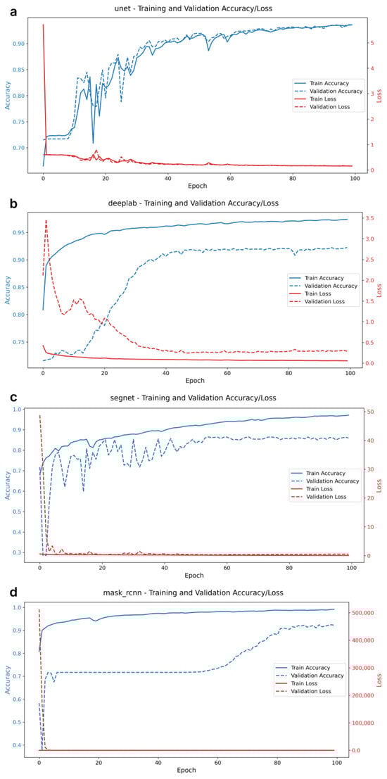 Notably, the plots of PA dynamics reveal different trends across the models. The U-Net and DeepLabV3+ models exhibit a smooth and gradual increase in PA as training progresses, indicating stable optimization and adaptation to the training data. In contrast, the SegNet model displays oscillatory changes in PA over a wide range before stabilizing after 40 epochs. A systematic improvement in PA for the Mask R-CNN model was observed after 60 epochs. The time spent on training each model was as follows: (1) U-Net—21 min 55 s; (2) DeepLabV3+—16 min 18 s; (3) SegNet—16 min 01 s; and (4) Mask R-CNN—18 min 38 s. These durations reflect the computational demands associated with each model’s complexity.
