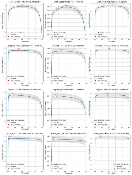 Figure 2, which illustrates the relationship between prediction thresholds and quality metrics). For all models, we calculated the average values of the metrics over a validation sample for each threshold and determined the optimal threshold that maximizes the numerical values. As a result of the analysis, the following optimal thresholds were determined: for the U-Net model, the optimal thresholds for the Dice coefficient (DC), Jaccard index (JI) and PA metrics were 0.43, 0.43, and 0.50, respectively; for DeepLab, the optimal thresholds were 0.30, 0.30, and 0.42; for SegNet, the optimal thresholds were 0.15, 0.15, and 0.37; and for Mask R-CNN, the optimal thresholds were 0.05, 0.06, and 0.17. The similarity in optimal thresholds for the DC and JI metrics is due to the mathematical relationship between the two metrics. Despite the differences in their calculation formulas, both metrics assess similar aspects of overlap between the predicted mask and the ground truth segmentation mask.
