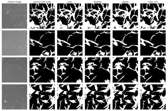 Figure 4, which illustrates a comparison between actual and predicted segmentations. The U-Net, DeepLabV3+, and Mask R-CNN models demonstrated the highest accuracy in extracting cell boundaries, particularly when compared to the SegNet model, which performed less effectively in extracting complex and small structures of cell morphology. On the masks predicted by SegNet, flaws in segmentation such as rough boundaries and missing details can be observed, especially in areas where cells have curved or complex shapes. Despite the high segmentation accuracy of the Mask R-CNN model, the masks predicted by this model are characterized by poorly defined cell edges. These irregularities appear as jagged contours. This may be due to the fact that Mask R-CNN, focusing on the instance-segmentation task, selects objects of certain classes in the image. The algorithm focuses on the exact localization of objects but does not always reproduce boundaries. In this respect, U-Net and DeepLabV3+ demonstrate greater accuracy in contour reconstruction.