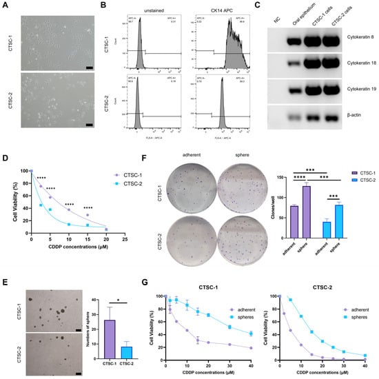 Establishment and characterization of CTSC-1 and CTSC-2 cells. (A) Morphology of CTSC-1 and CTSC-2 cells. Scale bars = 200 µm. (B) Flow cytometry sorting of CK14-positive squamous epithelial tumor cells. (C) RT-PCR analysis of epithelial markers CK8, CK18, and CK19 mRNA expression in CTSC-1 and CTSC-2 cells. (D) Dose–response curves of CTSC-1 and CTSC-2 cells treated with CDDP for 48 h. (E) Representative images and quantification of neospheres formed by CTSC-1 and CTSC-2 cells after 6 days of culture. Scale bars = 200 µm. (F) Colony formation assay to investigate the self-renewal ability of adherent CTSC-1 and CTSC-2 cells and sphere CTSC-1 and CTSC-2 cells. (G) Dose–response curves of adherent CTSC-1 and CTSC-2 cells and sphere cells treated with CDDP for 48 h. * p < 0.05, *** p < 0.001, **** p < 0.0001.