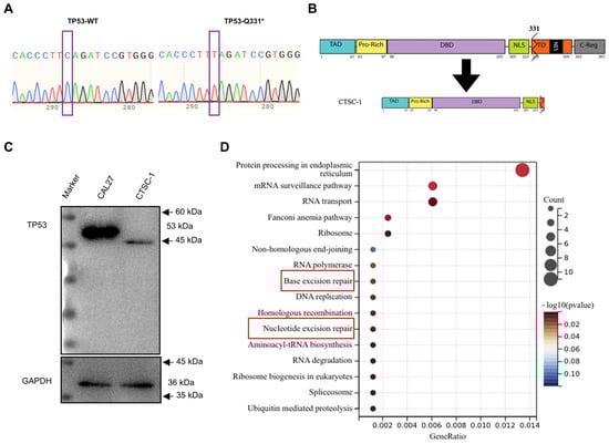 Distinct TP53 mutation and gene expression patterns in CTSC-1 and CTSC-2 cells. (A) Sanger sequencing confirming TP53 mutation in CTSC-1 cells. (B) Schematic representation of TP53-WT and TP53-Q331*. (C) Western blot analysis of TP53 protein expression in CTSC-1 cells using N-terminal antibody. The full-length TP53 expressed in CAL27 cells was used as a control. GAPDH served as a loading control. (D) Conducting pathway enrichment analysis of CTSC-1 harboring TP53-Q331* vs. CTSC-2 by KEGG.