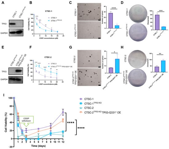 To determine whether the differences in chemoresistance, stemness, and gene expression can be attributable to TP53-Q331* activity, we employed CRISPR/Cas9-mediated gene editing to generate TP53 knockout CTSC-1 and CTSC-2 cells (CTSC-1TP53 KO and CTSC-2TP53 KO) (Figure 3A,E). The TP53 knockout resulted in significantly reduced chemoresistance, sphere-forming efficiency, and colony-forming ability in CTSC-1 cells (Figure 3B–D). In contrast, ectopic expression of TP53-Q331* in CTSC-2TP53 KO cells (Figure 3E) was sufficient to enhance chemoresistance, sphere-forming efficiency, and colony-forming ability in CTSC-2 cells (Figure 3F–H), highlighting the crucial role of TP53-Q331* in driving chemoresistance and stemness in CTSC-1 and CTSC-2.