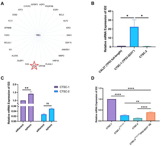 ID2 was a target of TP53-Q331*. (A) The GO-TRRUST analysis identified a distinct cohort of genes specifically regulated by TP53 activity. (B) qRT-PCR analysis of ID2 mRNA expression level in CTSC-1 and CTSC-2 cells. (C) qRT-PCR analysis of ID2 mRNA expression level in adherent CTSC-1 and CTSC-2 cells and sphere cells. (D) qRT-PCR analysis shows the correlation between ID2 mRNA expression level and TP53-Q331*. * p < 0.05, ** p < 0.01, **** p < 0.0001.