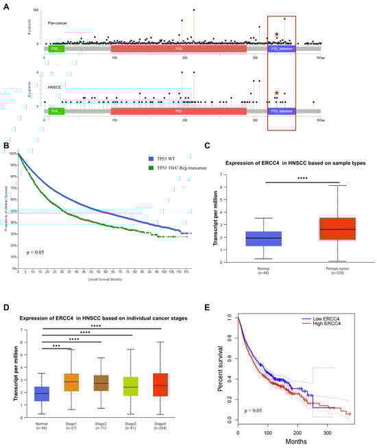 To further explore the correlation between TP53-Q331* mutation and tumor stage and prognosis, we analyzed its presence in the broader TP53 mutation spectrum and its association with patient survival. TCGA data indicated that the TP53-Q331* mutation is present in a variety of cancers, including HNSCC [] (Figure 6A). Premature termination mutations resulting in the loss of the TD domain constitute a significant subset of all TP53 mutations. Further TCGA analysis reveals that mutations truncating the TD and C-Reg domains are associated with patient survival outcomes (Figure 6B). To evaluate the clinical significance of our findings, we conducted an analysis of ERCC4 expression using data from TCGA []. Our analysis revealed that ERCC4 expression is significantly elevated in tumor samples compared to normal tissues and correlated with cancer progression and prognosis (Figure 6C–E). Additionally, increased ERCC4 expression is associated with CDDP resistance in gastric cancer cells, aligning with our findings []. These findings suggest that both TP53-Q331* and ERCC4 might be associated with poor prognosis of HNSCC.