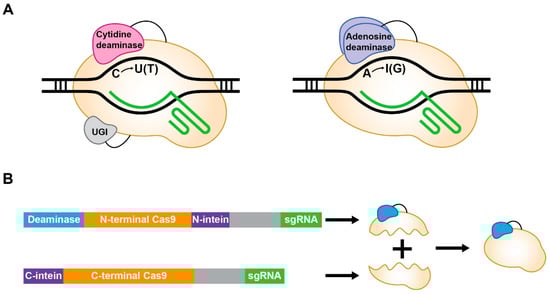 A base editor (BE) is a novel gene editing tool that is independent of DSBs [,]. BEs are composed of a CRISPR-associated (Cas) protein and a deaminase and are referred to as cytosine BE (CBE) and adenine BE (ABE), depending on the type of deaminase (Figure 1A). In the initial version of the CBE (BE1), Cas9 from Streptococcus pyogenes (SpCas9) was functionally inactivated (dead Cas9, dCas9) to avoid DSB generation []. Subsequently, the function of dCas9 was partially restored (nickase Cas9, nCas9) for better editing efficiency (BE3). The editing efficiency of BE3 was further improved by adding a uracil glycosylase inhibitor (UGI), codon optimization, and ancestral reconstruction to generate BE4, BE4max, and AncBE4max, respectively [,,]. As cytidine deaminases, rat apolipoprotein B-editing catalytic subunit 1 (rAPOBEC1), human APOBEC3A (hA3A), and activation-induced cytidine deaminase (AID) have been used [,,]. Similarly, an adenosine deaminase, tRNA adenosine deaminase (TadA), has been fused to nCas9 to generate an ABE []. Because natural TadA is ineffective on DNA, mutated TadA (TadA*) is used in ABEs. Through several attempts, including additional mutations to TadA* (TadA-8e) and codon optimization, ABEs with high editing efficiency, such as ABE7.10, ABEmax, and ABE8e, have been developed [,,]. CBEs and ABEs convert cytosine and adenine to uracil and inosine, respectively. The resulting U-G and I-T mismatches are repaired by cellular mechanisms, and new T-A and G-C pairs are generated. Consequently, BEs can accomplish C-to-T or A-to-G editing in a target site at single-nucleotide resolution.