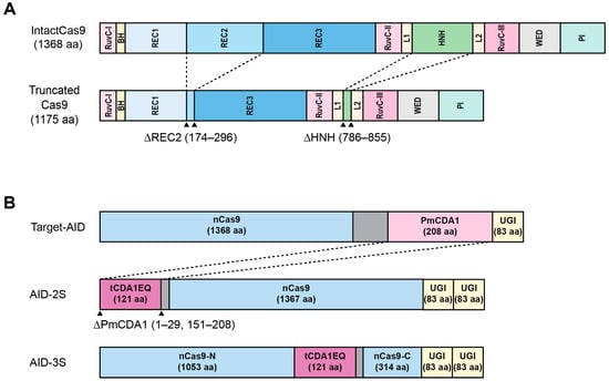 A structural study revealed that single deletions of the REC2, REC3, HNH, and RuvC-III domains do not impair the DNA binding affinity of dCas9 []. Each domain deletion can be stacked to generate small-sized dCas9, although it is less functional compared with the single-deletion variants. A similar strategy was applied to a BE to reduce its size []. For ABE8.17 [], the deletion of REC2 (Δ174–296), REC3 (Δ509–672), HNH (Δ786–855), or RuvC-III (Δ1044–1081) was evaluated [], and ABE8.17 tolerated a single deletion of REC2 and HNH. In addition, ABE8.17 with a double deletion (REC2 + HNH) retained an editing efficiency similar to that of ABE7.10 (Figure 2A). Notably, for AncBE4max carrying an REC2 or an HNH deletion, the editing efficiency was significantly lower.