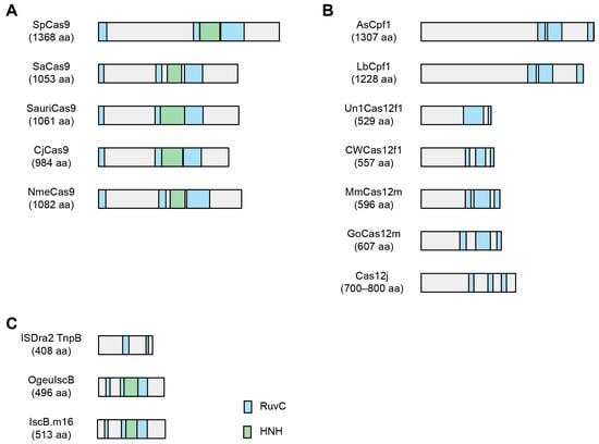 Since the CRISPR system was first discovered [], diverse Cas9 protein orthologs have been identified through phylogenetic studies []. For some Cas9 orthologs, the REC domain is intrinsically truncated [,] and has a relatively smaller size compared with SpCas9; thus, they may be useful for constructing hypercompact BEs (Figure 3A).