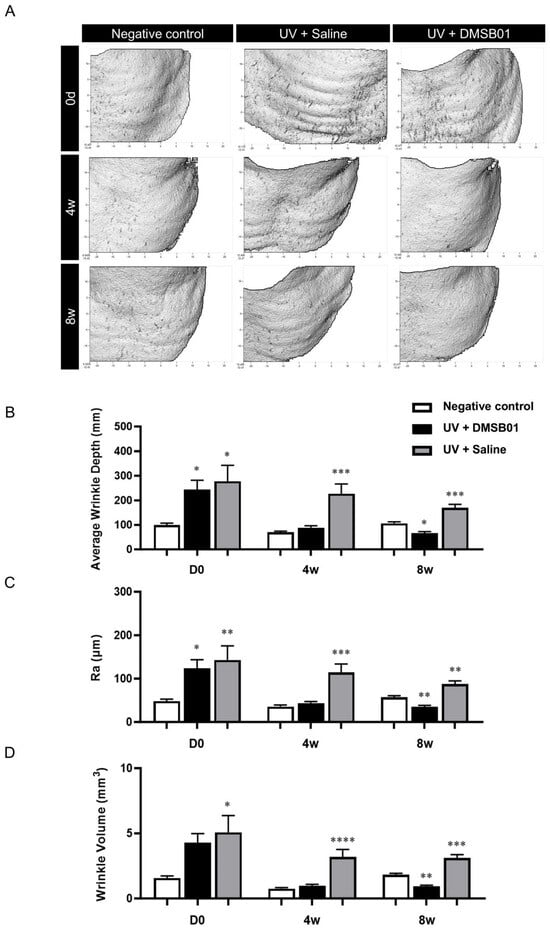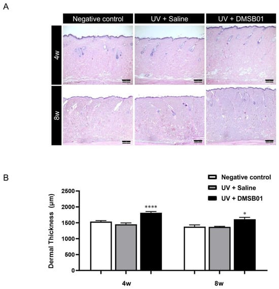 2.5. DMSB01 Improved the Wrinkles and Dermal Thickness in UVB-Photoaged Rats
