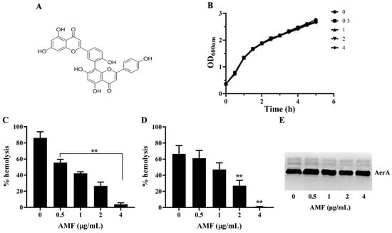 AMF without anti-A. hydrophila activity could directly inhibit the activity of AerA. (A) Chemical structure of AMF. (B) Growth curves of A. hydrophila co-cultured with various concentrations of AMF. (C) Hemolytic activities of bacterial supernatants co-cultured with AMF. (D) Hemolysis of purified AerA with indicated concentrations of AMF. (E) AerA production levels in bacterial supernatants after co-culturing with AMF. Data in (C,D) are mean ± SD of three independent experiments. ** p < 0.01 when compared with AMF-free group.