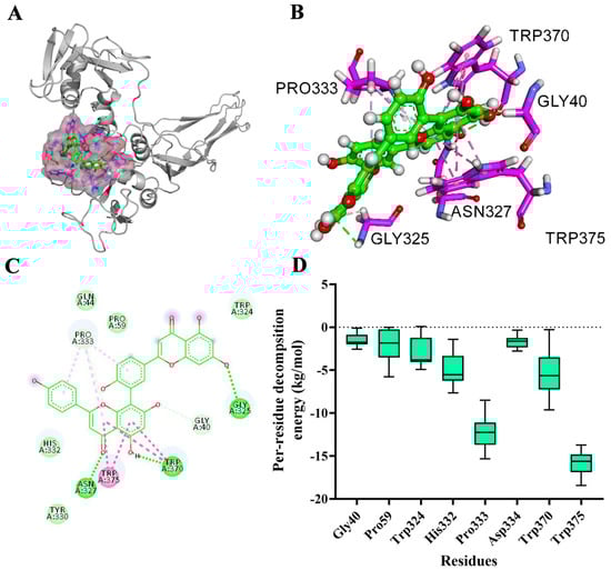 According to the result of the root-mean-square deviation (RMSD) values (Supplementary Figure S1), the system acquired equilibrium at the end of the simulation with an adequate force field and simulation protocol. The binding mode of AMF-AerA at a stable state is shown in Figure 2A and B. Gly40, Pro59, Trp324, His332, Pro333 Asp334, Trp370, and Trp375 were involved in the binding of AMF to AerA (Figure 2C). According to the results of the MM-GBSA method, the binding free energy of the AMF-AerA complex was calculated to be −22.16 kcal/mol. Pro333 and Trp375 were suggested to be the main binding sites of the complex according to the results of energy composition analysis (Figure 2D).