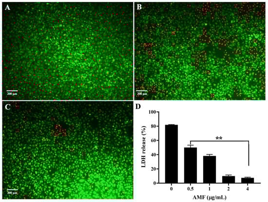 The protective effect of AMF on AerA-induced cell injury. (A) Untreated A549 cells; (B) Cells treated with AMF-free AerA; (C) Cells treated with AerA plus 4 μg/mL AMF; (D) LDH release of A549 cells in cell supernatants after treatment with AerA and indicated concentrations of AMF. Green indicates live cells, red indicates dead cells. Data in (D) are mean ± SD of three independent experiments. ** p < 0.01 when compared with AMF-free group.